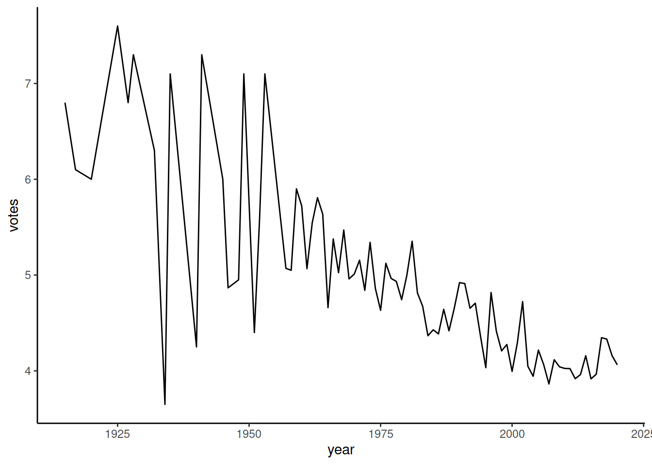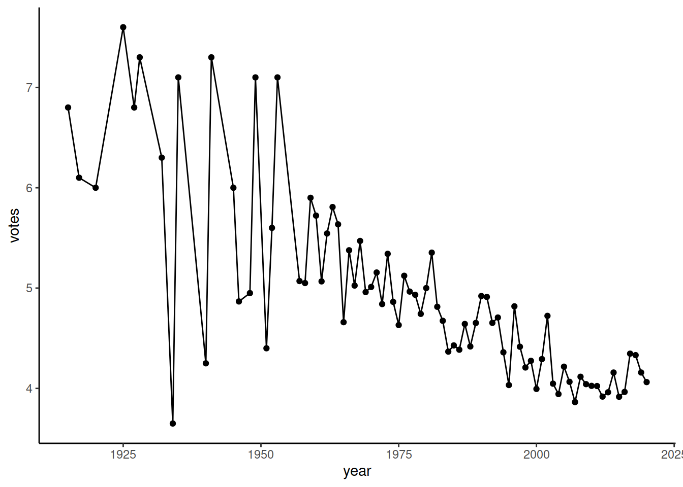 mapping = aes(x = year, y = votes))