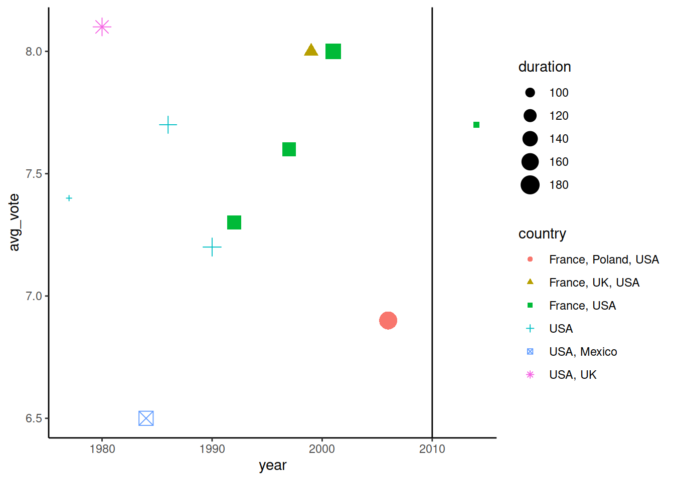 Повторим предыдущий график (фильмы Линча), и в mapping укажем, что цвет и форма точки задаются по значениям из колонки country, а размер точки берется из значений в колонке duration.