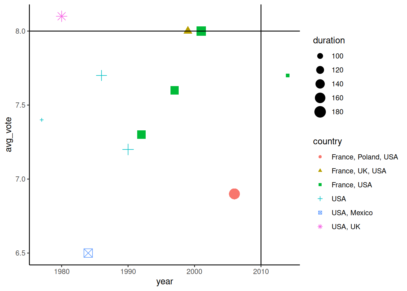 Аналогично geom_vline() позволяет нанести на график горизонтальную линию. Для этого надо указать yintercept - значение на оси OY, из которого будет выводиться линия, параллельная OX. Графически отметим фильмы, которые имеют avg_vote больше 0. У Дэвида Линча был один фильм (согласно датасету), у которого оценка была заметно больше 8, и тот был задолго до 2000 года: