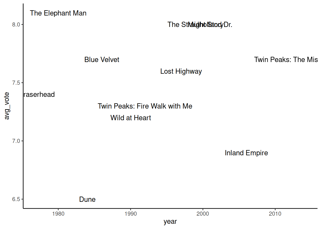 mapping = aes(x = year, y = avg_vote, label = original_title),