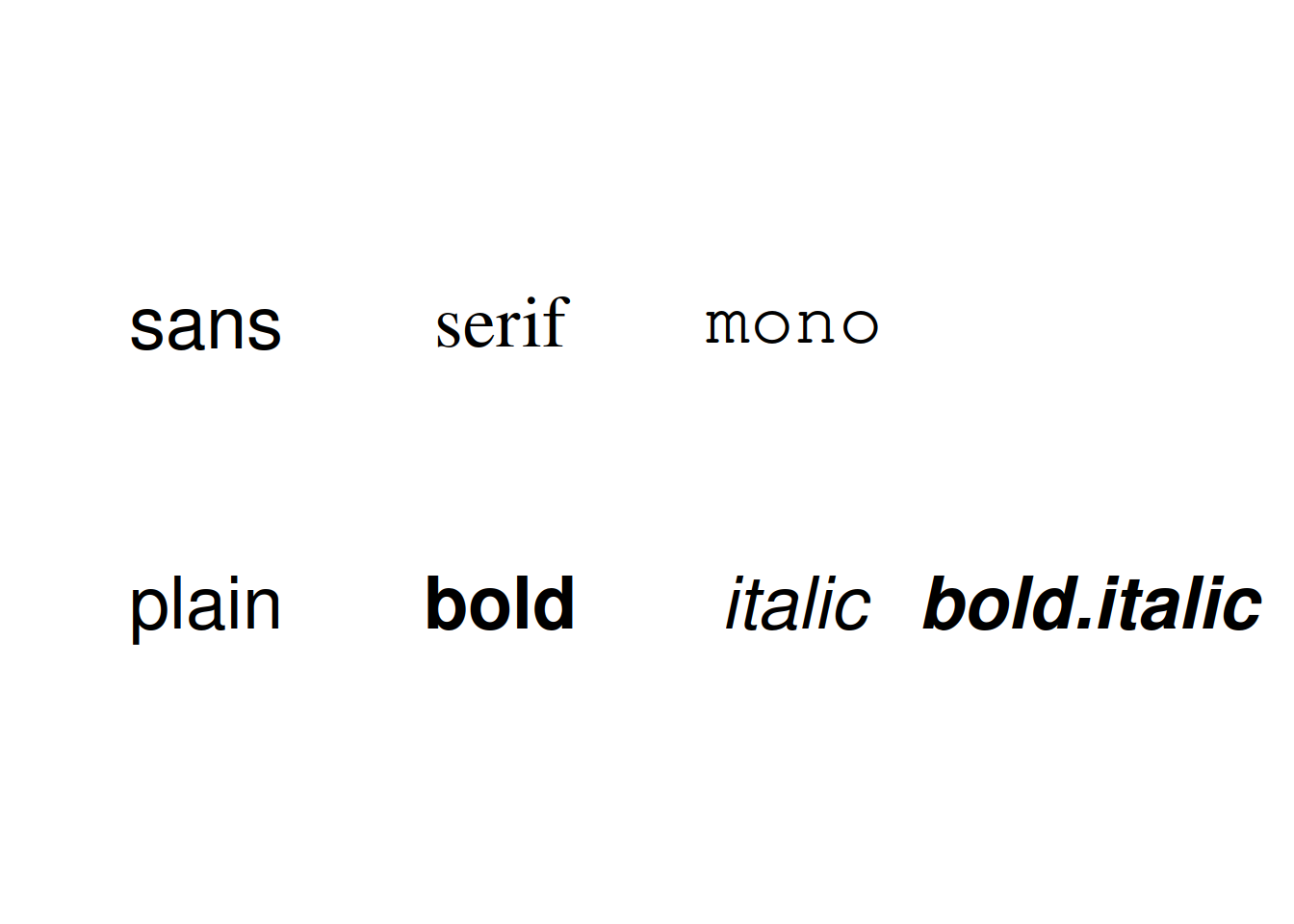 df_fontface <- data.frame(x = 1:4, fontface = c("plain", "bold", "italic", "bold.italic"))
