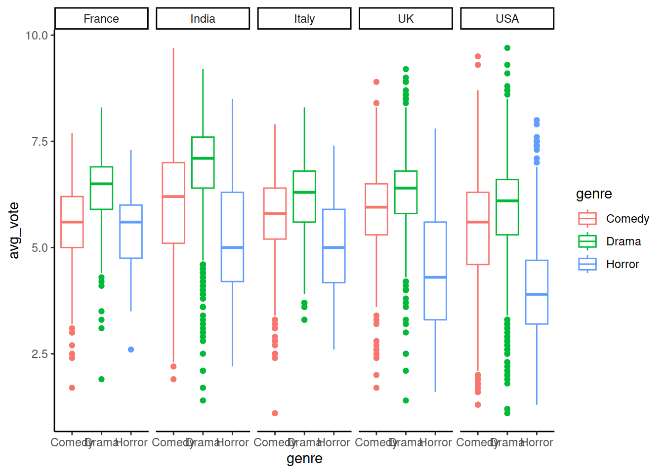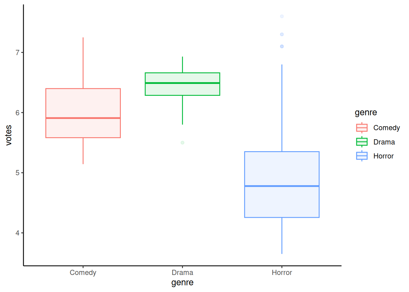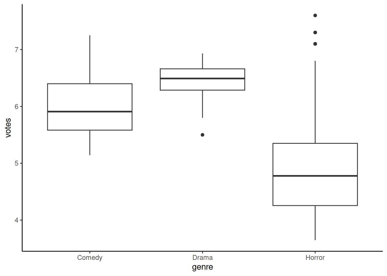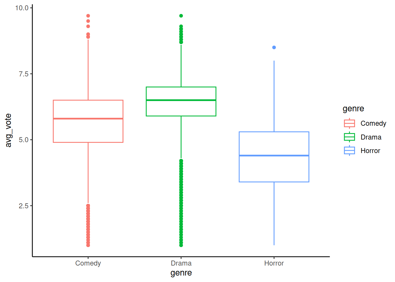 Геом для отрисовки боксплотов, по конструкции похож на geom_bar(). Отрисуем боксплоты распределений оценок фильмов трех разных жанров: