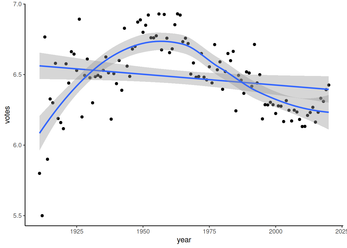 Построим по облаку точек фильмов из жанра Drama тренд imdb-оценок. Нарисуем сначала собственно облако точек, а потом зададим линию тренда с помощью loess и линейной регрессии.