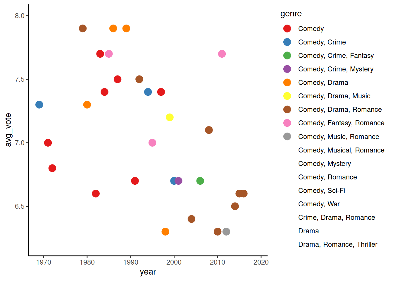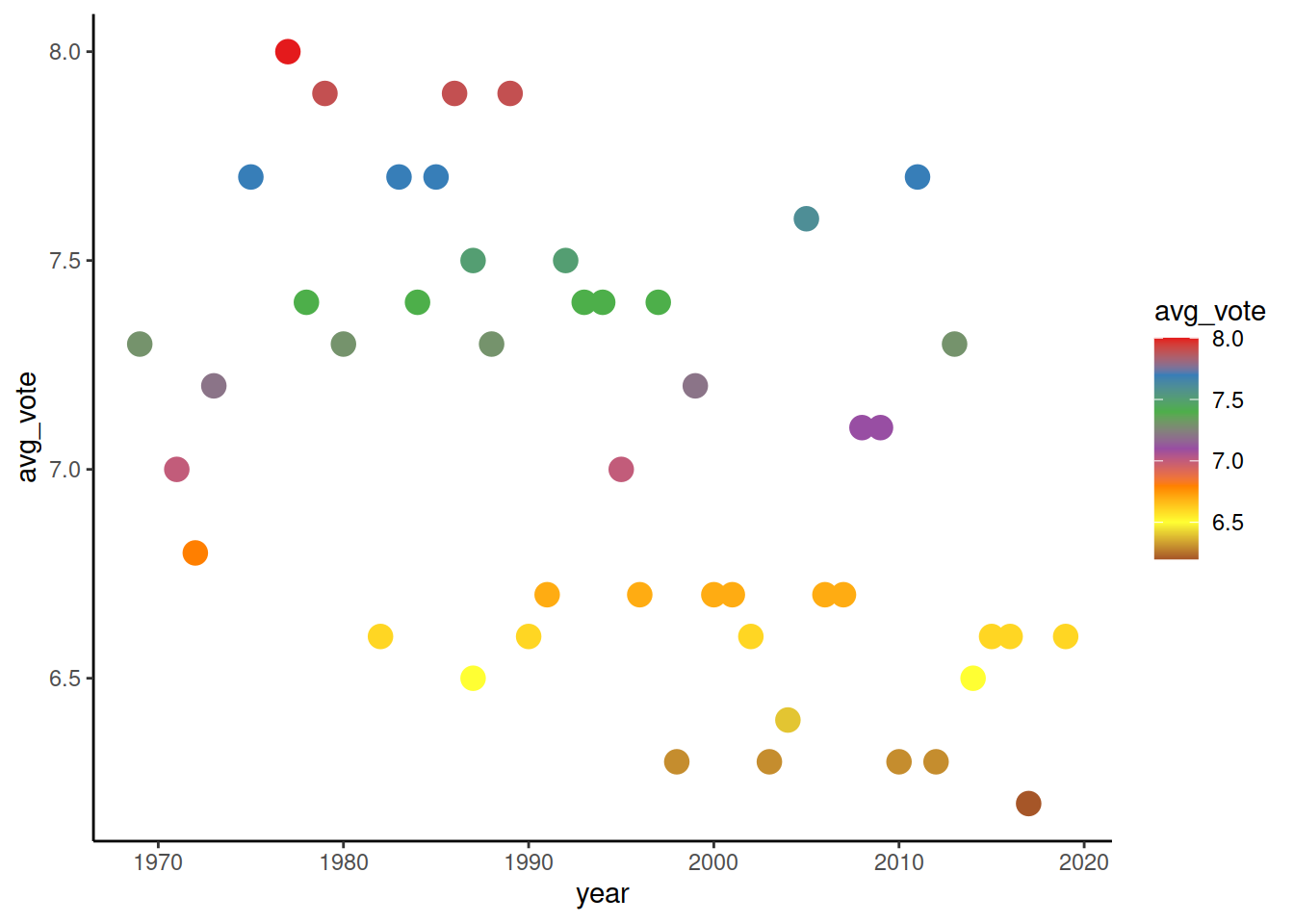 geom_point(aes(color = avg_vote), shape = 'circle', size = 4) +