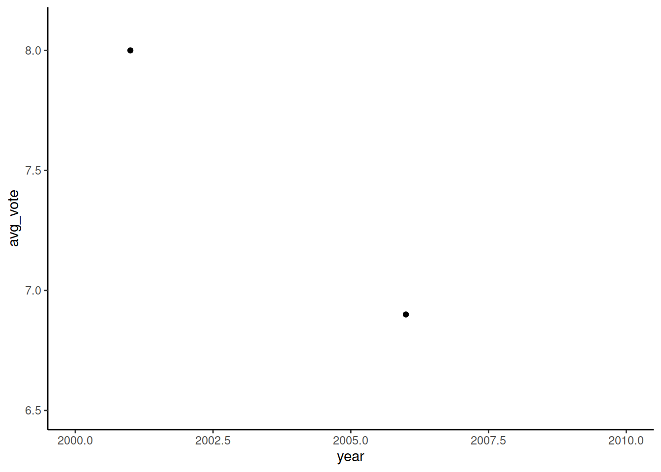 ggplot(imdb_lynch, aes(x = year, y = avg_vote)) +