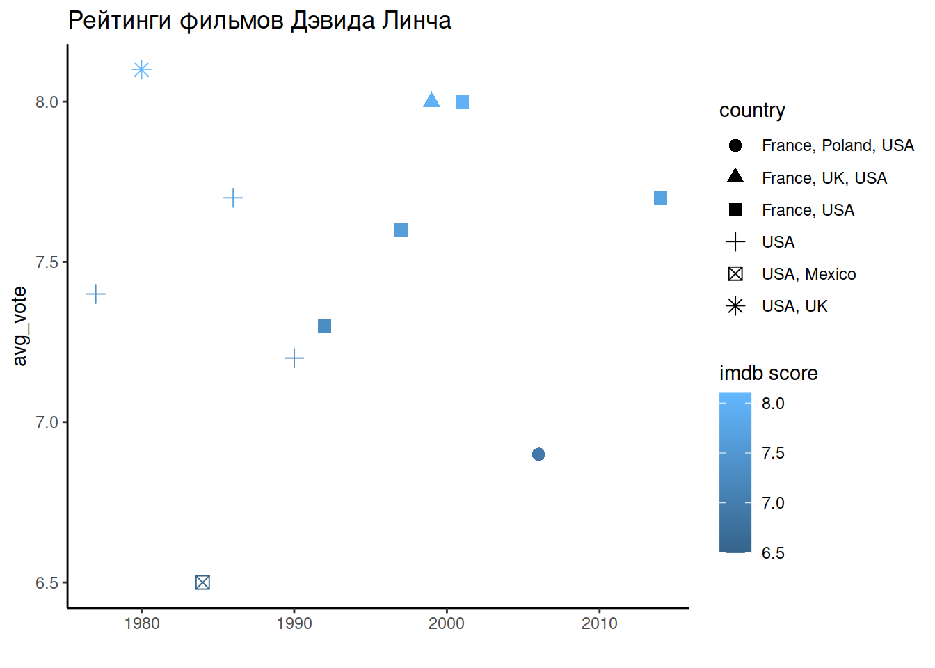 labs(title = 'Рейтинги фильмов Дэвида Линча',